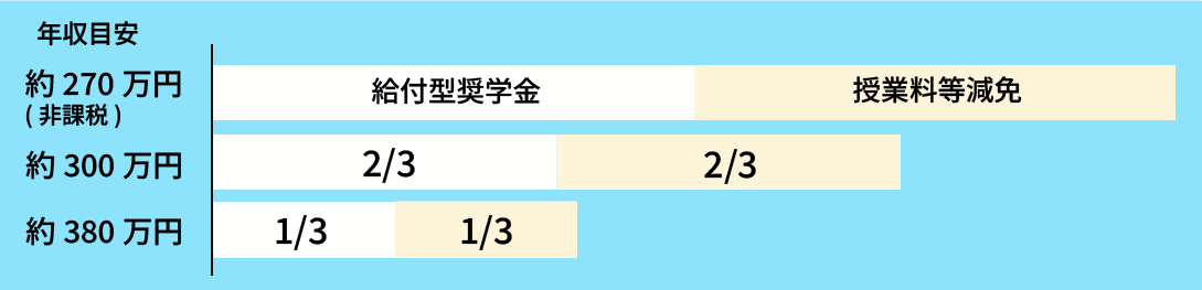 支給金額は世帯の所得金額に基づく区分により異なります。また、給付型奨学金の採用者は、授業料減税の対象者となります。