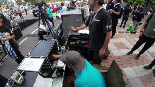最終日には池田のスーパースペシャルステージで音響セッティングを監修。元球場という音響的に難しい会場でしたが、独自のセッティング技術で音の広がりと聞きやすさを両立させました。また、北愛国交流広場での表彰式では、突然のスコールのような雨にも冷静に対応、4基のスピーカーを2基に集約し、機材を保護しながら音響品質を維持する対応で、会場を感動の空間へと導きました。