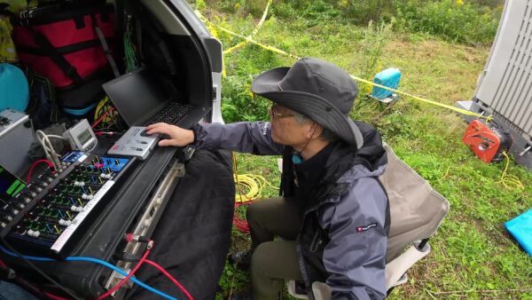 2日目のスペシャルステージ「パウセカムイ」では、マーティ講師は自ら車を運転して現地入りしました。ギャラリーエリアに機器を設置して、ファンに向けて心地よい音楽と正確な情報を届け、現場の空気を巧みに演出しました。