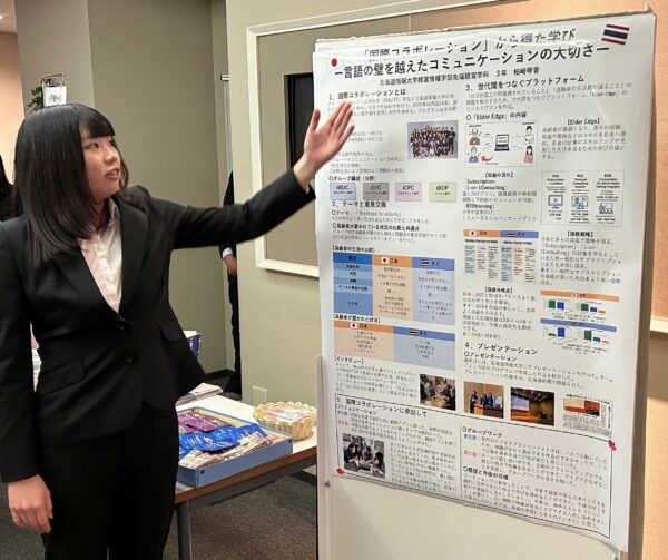 北海道情報大学と海外協定校のタイ・ラジャマンガラ工科大学タンヤブリ校(RMUTT)が連携して実施しているワークショップ「国際コラボレーション」に参加した柏崎琴音さん(先端経営学科3年)が、体験をもとに日本の学会で発表、国際共修で得た学びや、これからのグローバル人材のあるべき姿について考察、提言しました。