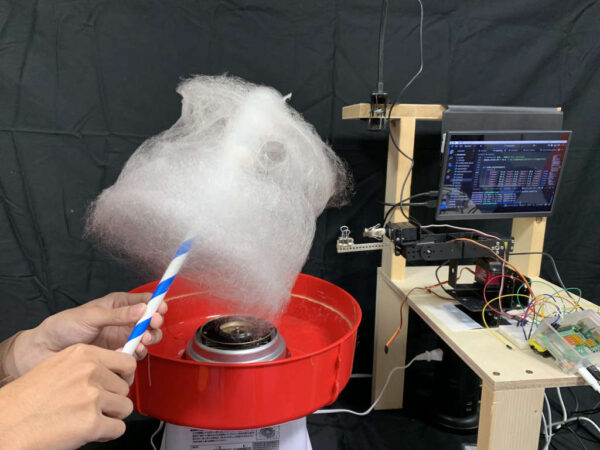 私たちは、全自動でわたあめを作る「全自動わたあめ機」を制作しました。 自作のロボットアームを設置し、わたあめを回転させる機構を組み込んでいます。主にサーボモーターを使って回転させ、そこにわたあめを巻き取っていきます。 さらに画像処理を用いて角度を調整しながら持ち上げ、最終的にわたあめが完成する、という仕組みです。最初は、「わたあめを巻き取る機械を作ったら面白いのではないか」という発想から始まりました。調べていく中で、わたあめの自動販売機の動画を見つけ、それを参考に制作を進めていきました。