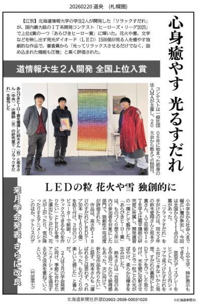 テクノロジーと創造性を活かした日本最大級のオンラインものづくりコンテスト「ヒーローズ・リーグ2025」で、辻順平講師(情報メディア学科)研究室に所属する鈴木愛翔さん、坂本夕真さん(ともに3年)の、光を使った「リラックスすだれ」が全国上位入賞したことが、2月20日の北海道新聞で紹介されました。
